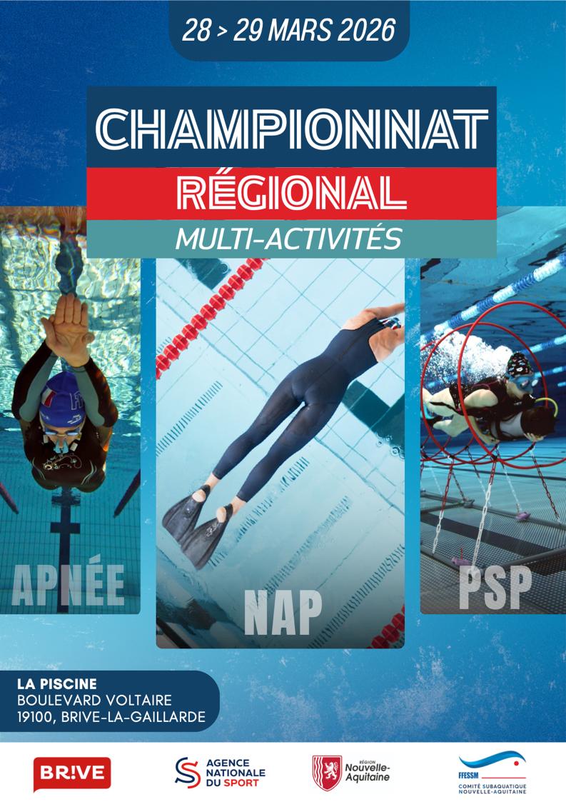 Championnat Régional multi-activités Ouverture des inscriptions à partir du 28 février 11h - Prix : 35€ Planning prévisionnel : Samedi 28/03 9h00 - 12h00 : statique 14h30 - 17h45 : dynamique mono - bipalmes Dimanche 29/03 8h30 - 11H15 : dynamique sans plames 14H45 - 15h30 : sprint endurance